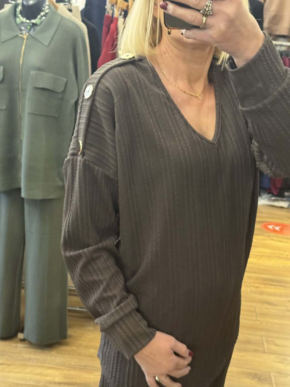 CARLY long sleeve set with gold button detail – BROWN textured fabric