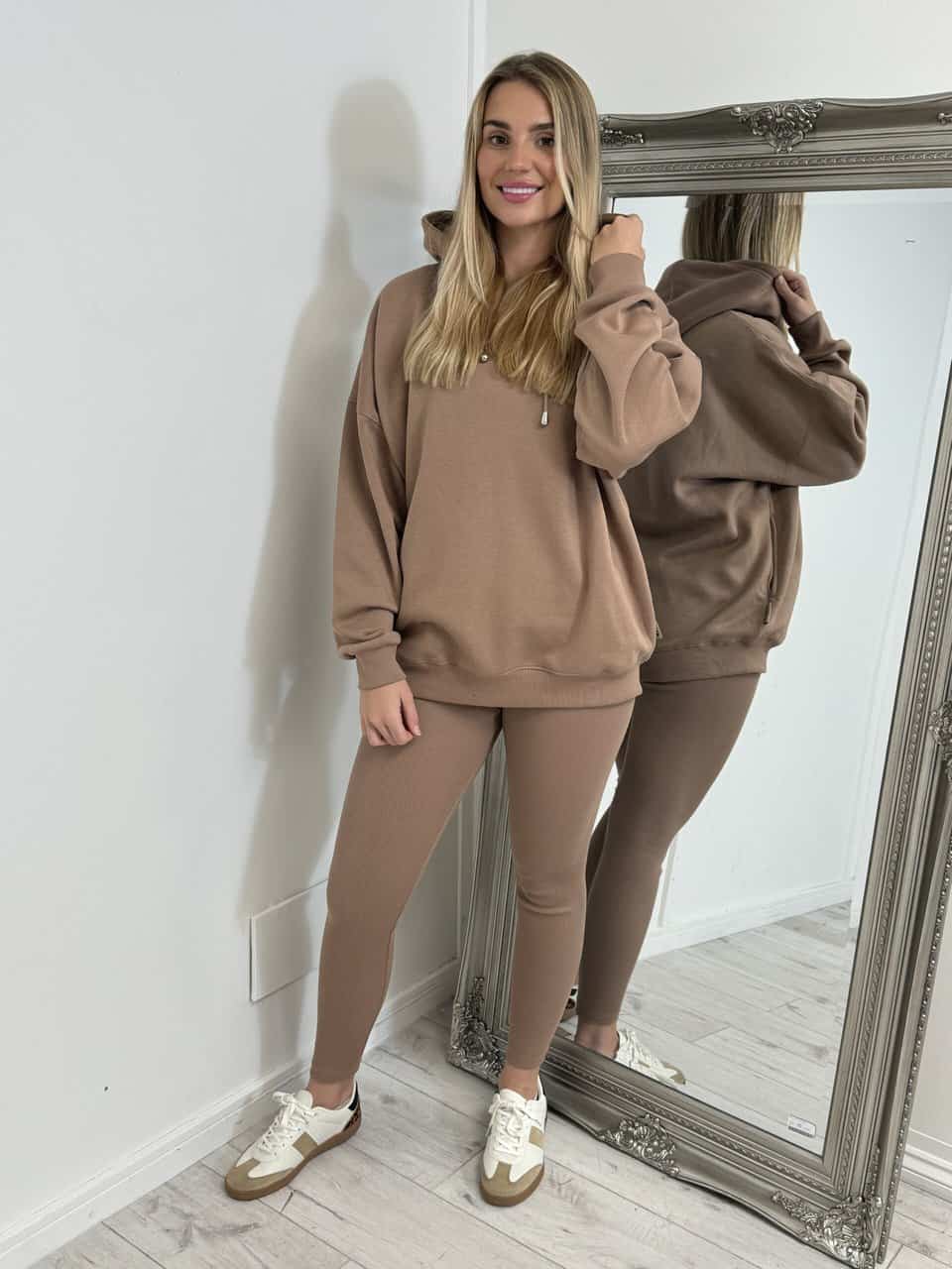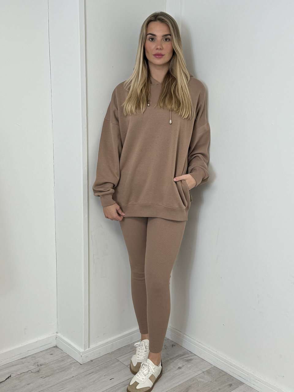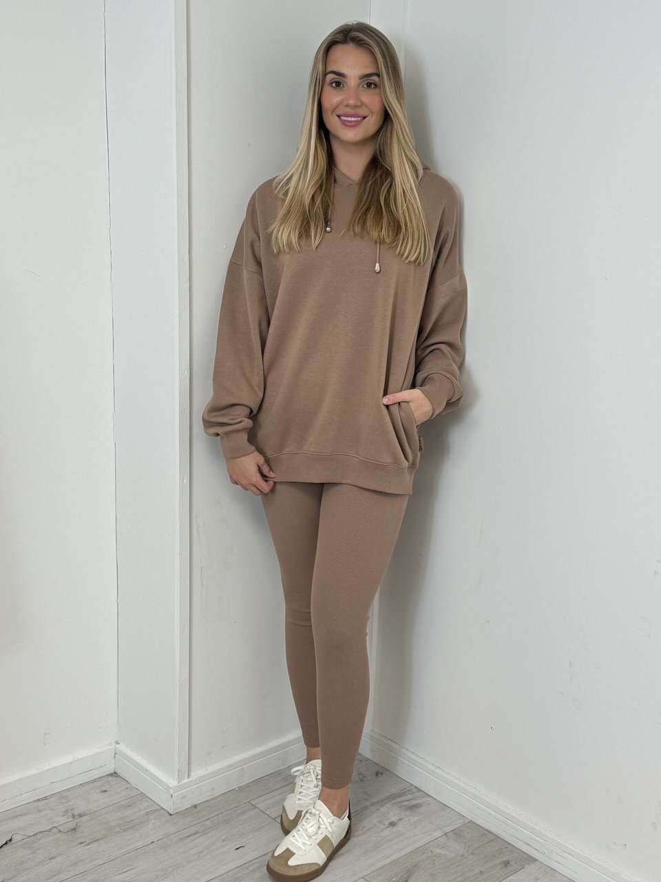 The elasticated stretch legging provides a comfortable fit that moves with you throughout your day. The oversize hoodie offers a relaxed and stylish look, perfect for lounging at home or running errands. The side pockets offer convenient storage for your phone or other small items.